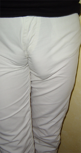 I look down and see how your little trick indeed managed to get my jeans totally soaked with precum. I wonder how I'm gonna dare walk outside with that 4-inches wet spot adorning my ever more desperately hard cock-head. But you usher me out of the fitting-room, leaving me to wait at the door while you change back into your mini. You come out holding the shorts and reach down, your maddening fingers slowly teasing my pulsating boner through the wet material of my jeans. You know you again have me on the brink of spurting as you say: